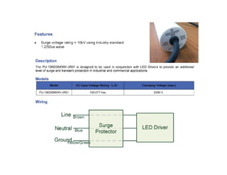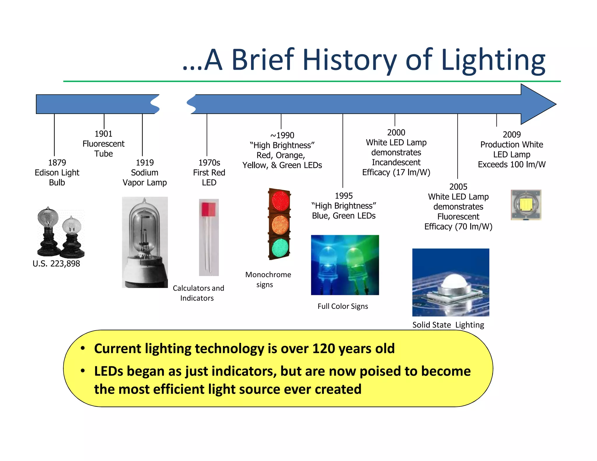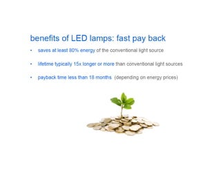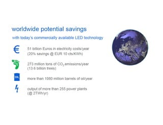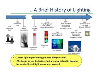 This document provides an overview of LED lighting technology and considerations for LED lighting implementation. It discusses the history of lighting technology leading up to LEDs. It then covers key advantages of LED lights like energy efficiency, longevity, and environmental friendliness. Some challenges of LED technology like heat dissipation, driver lifespan, and rapidly changing performance are also addressed. Recommendations are provided on when LED lighting is appropriate and factors to consider like lumens per watt, heat dissipation design, and chip technology. Standards and certifications for LED products are also briefly discussed.