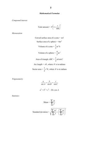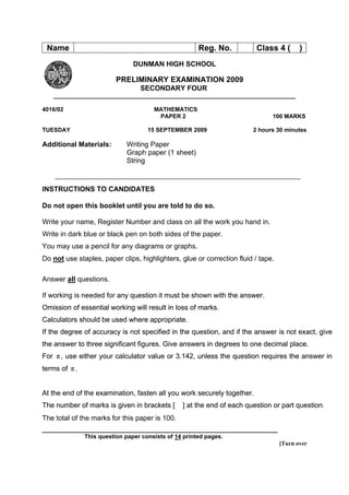 This document contains instructions and questions for a mathematics exam. It provides information about the exam such as the date, time allowed, materials permitted, and instructions for completing and submitting the exam. The exam contains 7 multi-part questions testing a variety of mathematics concepts including algebra, geometry, trigonometry, statistics, and matrix operations.