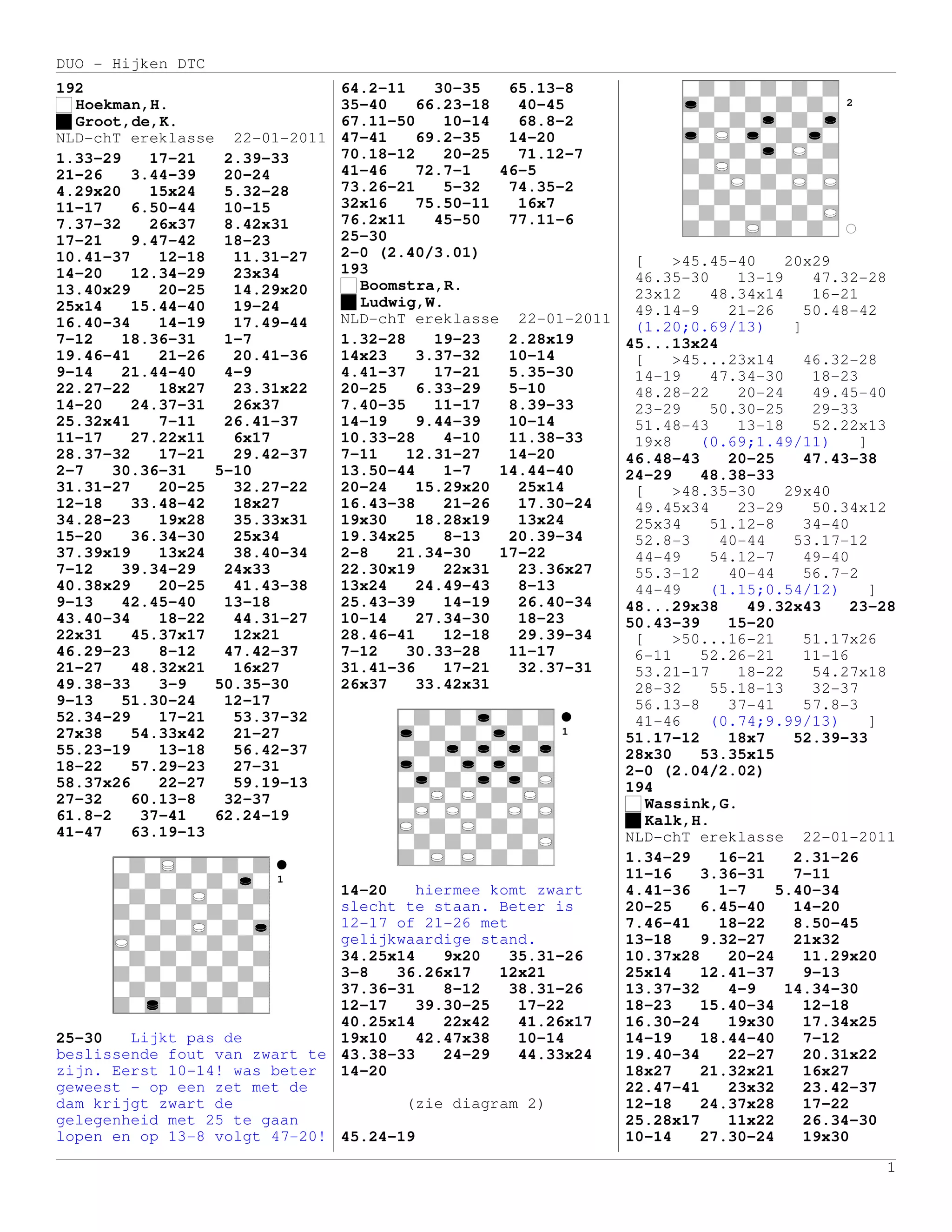 This document contains the notation for multiple games of Dutch championship draughts played on January 22, 2011. It lists the players' names and game scores, along with the moves made in each game notated with standard draughts notation. Several games are commented on with brief analyses and suggestions for alternative moves.