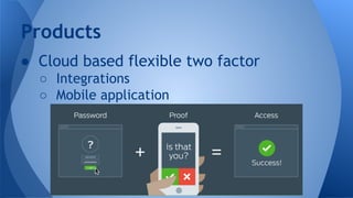 This document discusses a cloud-based two-factor authentication company that was founded by Jon Oberhide and Dug Song as Scio Security in Tech Brewery. It experienced 325% revenue growth in 2013 and now has over 2,500 organizations across 80 countries as customers. The company is considering a rebranding and next round of funding while their secret sauce includes push notifications, community, and responsive feedback.