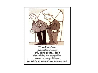 This document discusses quality control and durability factors in concrete. It defines quality as conformance to requirements and durability as a concrete's ability to resist deterioration when exposed to the environment. Several factors influence concrete durability, including the materials used, water-cement ratio, compaction, curing and the physical and chemical conditions of the service environment. Common durability issues include corrosion, cracking from sulfate attack or alkali-silica reaction, and carbonation reducing alkalinity. Proper quality control of materials and construction processes is needed to produce durable concrete.