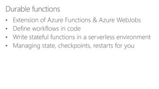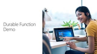 This document provides examples and documentation on Azure Durable Functions patterns and concepts. It includes examples of orchestrator and activity functions, orchestration triggers, and common patterns like function chaining, fan-out/fan-in, and asynchronous HTTP responses. It also covers durable function concepts such as the control queue, work item queue, and history table.