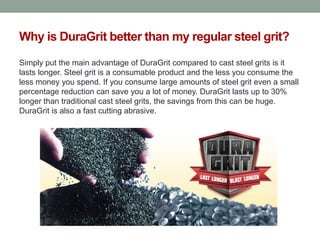 Duragrit is a cost-effective steel grit abrasive specifically designed for use in blast rooms, offering a longer lifespan than conventional steel grit by lasting up to 30% longer. Its production utilizes high-quality forged steel offcuts, ensuring durability and reducing consumption costs. Available in 1 tonne pallets or bulk bags, Duragrit promises significant savings for users through its efficient cutting performance.