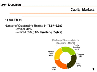 Duratex reported its first quarter 2005 results. Net revenues increased 22% to R$306 million compared to the first quarter of 2004. EBITDA grew 70% to R$91 million, with an EBITDA margin of 30%. Shipments increased slightly for wood products but decreased 4% for Deca division products compared to the first quarter of 2004. Dividends increased significantly to R$58 million, up 28% compared to 2004.