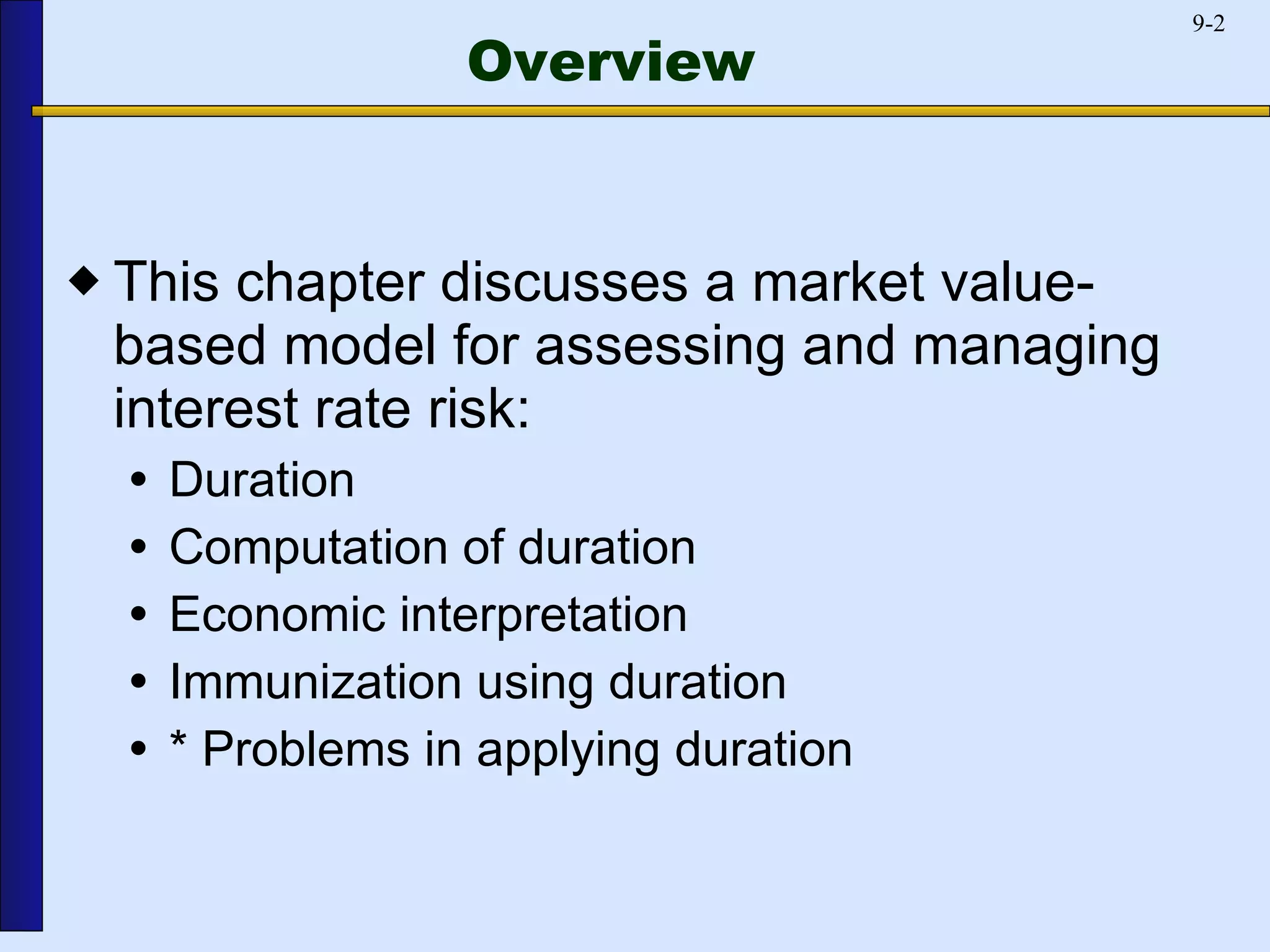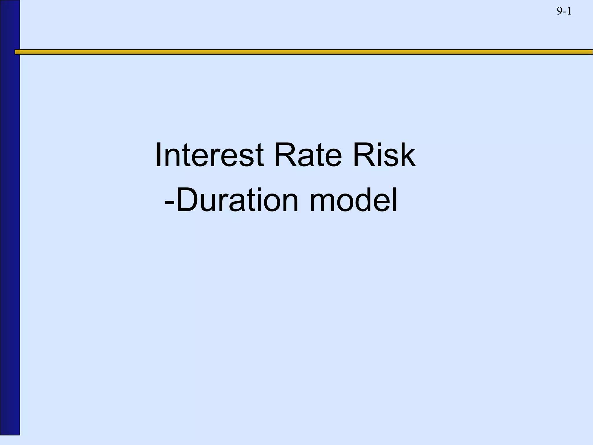 This document discusses duration, a model for measuring interest rate risk. Duration is a measure of how the price of a bond or loan will change in response to changes in interest rates. It represents the weighted average time until cash flows are received. Longer maturity bonds and loans have higher durations, meaning their prices are more sensitive to interest rate changes. Bonds with higher coupons have lower durations. Duration can be used to immunize a financial institution's balance sheet against interest rate risk by matching asset and liability durations.