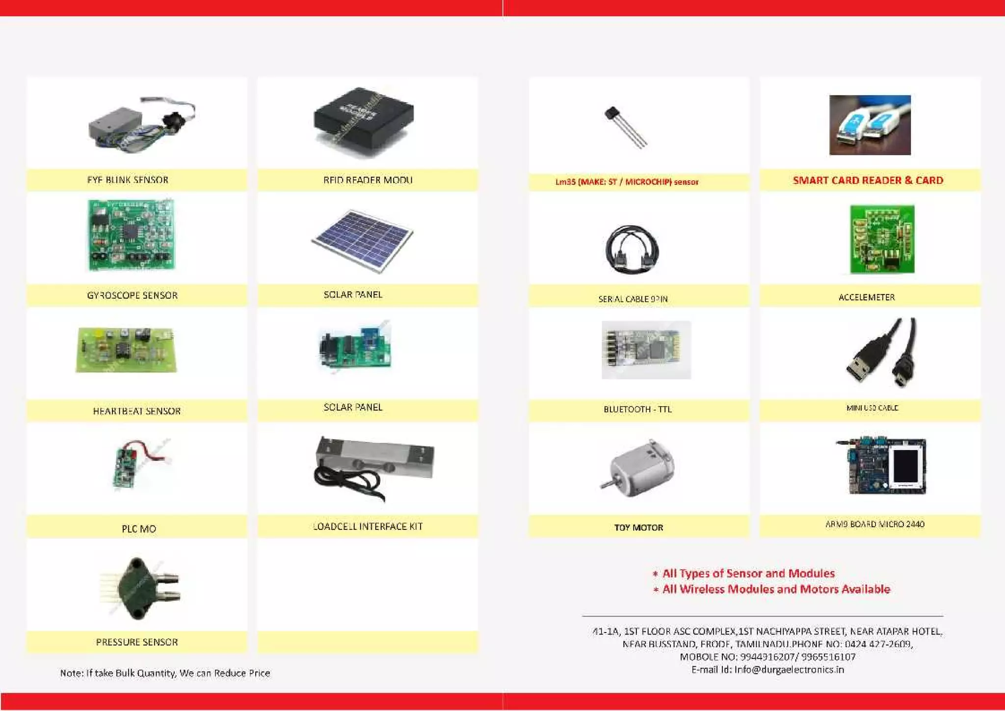 DURGA ELECTRONICS WIRELESS MODULE: 1. GSM MODEM 2 .GPS MODULE 3 .GPS MODULE WITH EXTERNAL ANTENNA 4 .BLUE TOOTH-RS232 5 .RF-ID READER 6. CC 2500 / 2.4 Ghz TRANSRECEIVER MODULE- ZIGBEE WITH RS 232 7 .ZIGBEE WITH USB 8 .RF-TX AND RX (434 MHz) 9 .CC 2500 / 2.4 Ghz TRANSRECEIVER MODULE- ZIGBEE 10. GSM 3G MODEM SENSORS: 1 .GAS SENSOR - MQ2 2 .GAS SENSOR - MQ3 3. GAS SENSOR - MQ5 4 .GAS SENSOR - MQ7 5.PIR SENSOR 6 .TEMPERATURE SENSOR - LM 35 7 .ULTRASONIC SENSOR 8.HUMIDITY SENSOR WITHOUT PCB 9 .OBSTACLE SENSOR WITH 2 FEET DISTANCE 10.EYE BLINK SENSOR 11 .PRESSURE SENSOR 12 .HALL EFFECT SENSOR 13 .MEMS SENSOR COMPONENTS 1 .ATMEL - 89S52 2. PIC 16F877A 3 .HT 12E 4 .HT 12D 5.MAX233 6.ULN 2003 7 .HT 640 8 .HT 648 9.REGULATOR - 7805 10.REGULATOR - 7812 11.RMC CONNECTOR - 2 PIN 12.RMC CONNECTOR - 3 PIN 13. RMC CONNECTOR - 4 PIN 14 .RMC CONNECTOR - 8 PIN 15. PULL UP RESISTOR 16.MCT2E –OPTO COUPLER 17.APR 9600 18.VOICE RECOGNIZATION IC - HM 2007 19 .VOICE RECOGNIZATION KIT 19. LCD - 16x2 20 .IC BASE -DIP - 8 PIN 21. IC BASE -DIP -14 PIN 22 .IC BASE -DIP -18 PIN 23 .IC BASE -DIP -20 PIN 24. IC BASE -DIP -28 PIN 25 .IC BASE -DIP -40 PIN 26 BERG CONNECTER MALE - 40 PIN 27 BERG CONNECTER FEMALE - 40 PIN 28.CRYSTAL OSCILLTOR – 11.0592MHZ 29 CRYSTAL OSCILLTOR – 20KHZ 30.BUZZER