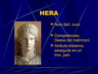 HERA Nom llatí:Juno Competències: Deesa del matrimoni Atributs:diadema, asseguda en un tron, paó