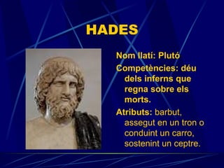 HADES Nom llatí:Plutó Competències: déu dels inferns que regna sobre els morts. Atributs: barbut, assegut en un tron o conduint un carro, sostenint un ceptre.