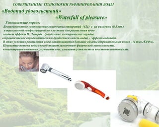 Документ описывает преимущества специального фильтра для воды, который улучшает качество душа, расслабляет, бодрит и имеет косметические свойства. Использование этого фильтра экономит расход воды до 50% и снижает потребность в моющих и косметических средствах, благодаря высокой степени очистки воды. Фильтр насыщает воду витаминами и маслами, что способствует здоровью кожи и волос.
