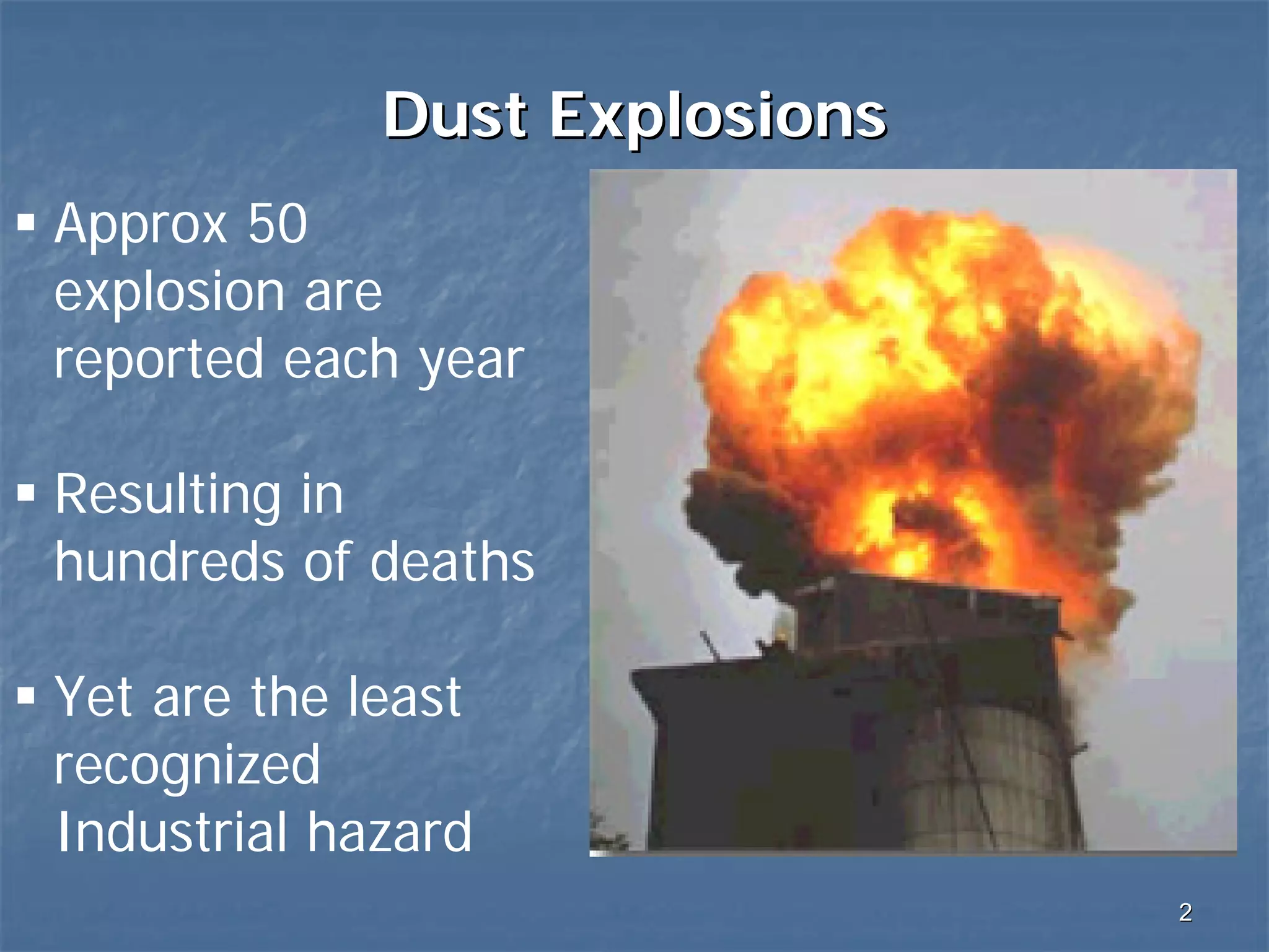 Dust explosions are a significant industrial hazard, with approximately 50 incidents reported annually, leading to numerous fatalities and injuries. A history of various dust explosion events highlights the risks associated with combustible dust from organic and synthetic materials, often causing secondary explosions and widespread damage. Effective firefighting strategies require a thorough understanding of the types of silos and the proper protocols to mitigate the risk of explosions during firefighting operations.