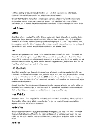 Dutch Bros is a popular coffee chain founded in 1992, known for its diverse menu that includes coffee, teas, and snacks. The menu features a wide range of drinks, including seasonal specials, custom flavors, and competitive prices, appealing to coffee lovers and those preferring non-coffee beverages. With a commitment to friendly service and community support, Dutch Bros continues to expand its presence across the United States.