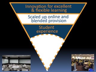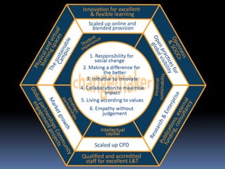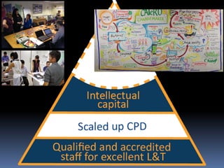 This document summarizes a study tour presentation given by Professor Alejandro Armellini at Northampton University. The presentation outlined Northampton's directions in learning and teaching, including embracing inclusive open practices and exceeding student expectations. It discussed innovative curriculum structures, assessment methods, and online/blended learning examples. Potential scenarios for 2020 showed decreasing physical students but increasing online/dual-mode students. The presentation proposed a "Northampton Blend" approach integrating online pre-session work and in-person seminars. It also introduced CAIeRO workshops to quickly design blended courses and a C@N-DO framework for staff professional development in learning and teaching.