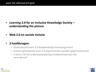 waar het allemaalom gaat Learning 2.0 for an Inclusive Knowledge Society – understanding the picture Web 2.0 en sociale inclusie 3 hoofdvragen: Ondersteund leren 2.0 daadwerkelijk levenslang leren? Kunnen geïsoleerde leren 2.0 experimenten worden gegeneraliseerd? Is leren 2.0 het onderwijslandschap fundamenteel aan het veranderen?