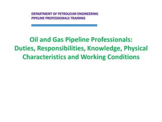 This document provides information on the duties, responsibilities, knowledge, physical characteristics, and working conditions of various oil and gas pipeline professionals. It describes the roles of oil pipeline operators and maintenance workers, control center operators, gaugers, utility workers, and tank farm operators. Similar details are provided for gas pipeline compressor operators, control operators, and utility operators. Essential skills, knowledge requirements, and personal characteristics are outlined for each role.