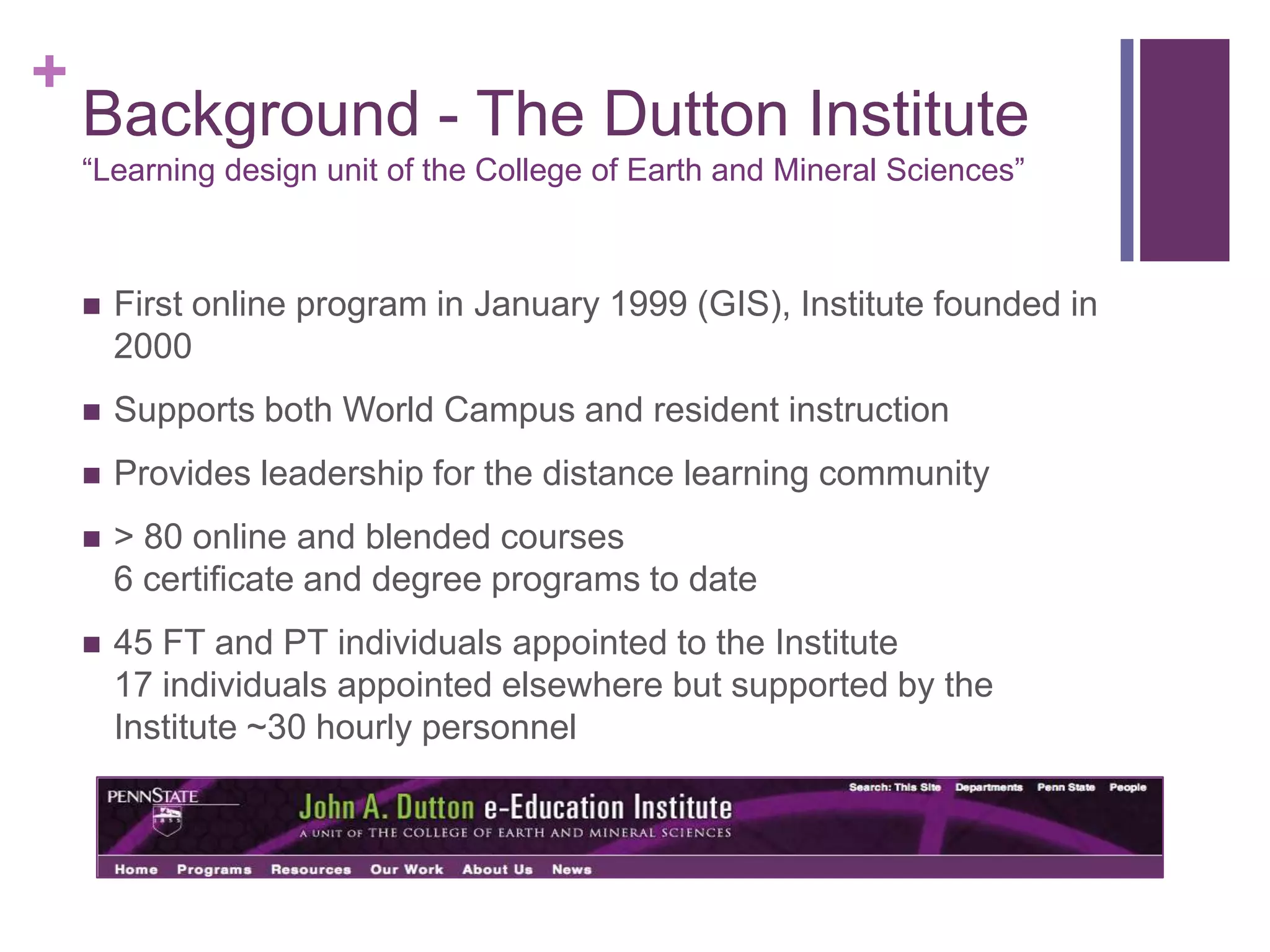 This document provides an overview of e-Learning at the College of Earth and Mineral Sciences at Penn State University. It discusses the background and founding of the Dutton Institute, which supports online and blended courses. It outlines the program development model and course development process. It then discusses the future of eLearning at the college, including creating personalized learning experiences and strengthening online communities. Key challenges are also mentioned, such as providing seamless access and increasing financial support.