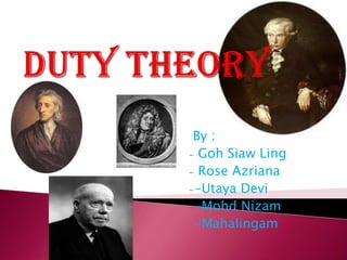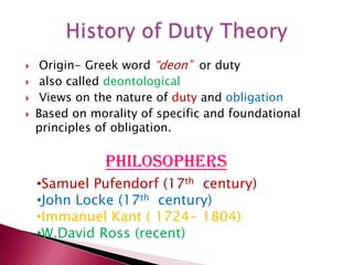 Duty theory is a deontological ethical theory that focuses on morality of duties and obligations. It originated from Greek philosophy and was developed by several philosophers including Samuel Pufendorf, John Locke, and Immanuel Kant. Kant emphasized acting in accordance with a single moral duty or categorical imperative to treat people as ends in themselves, never merely as a means. More recently, W.D. Ross proposed that there are several prima facie duties that can sometimes conflict, including fidelity, reparation, gratitude, justice, beneficence, self-improvement, and nonmaleficence.