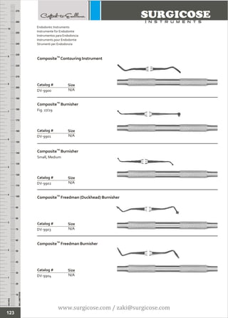 The document contains a comprehensive catalog of dental restorative instruments, including burnishers, filling instruments, and various other tools used in dentistry. Each instrument is listed with details such as catalog number and size. The instruments are categorized based on their specific use, emphasizing the variety available for dental practitioners.