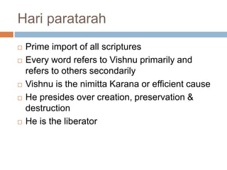 Madhwa philosophy has nine tenets including that Vishnu is the primary and efficient cause of creation, preservation, and destruction of the world. It affirms that the world and individual souls are real, with an ultimate fivefold difference between God, individual souls, inanimate objects, one soul from another, and between souls and objects. Devotion is considered the means to attain moksha or liberation, through correct reasoning and practices such as ceasing harmful actions, listening, contemplation, and meditation on God.