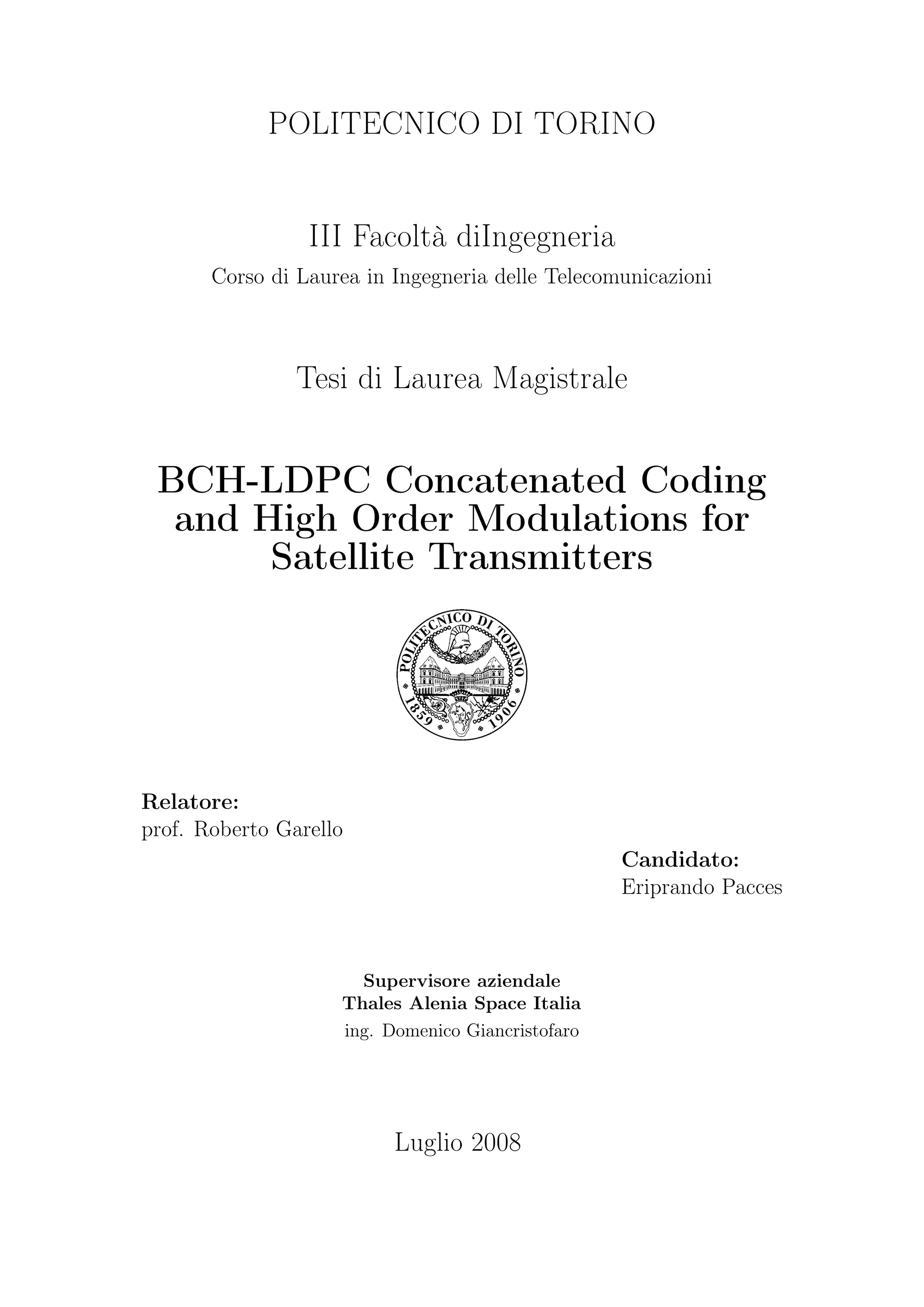 The thesis explores the integration of BCH-LDPC concatenated coding with high-order modulation schemes for satellite transmitters, emphasizing the importance of choosing effective modulation and coding schemes to achieve reliable data transmission. It details the development of versatile coding techniques like bit-interleaved coded modulation (BICM) and advanced forward error correction methods, particularly within the context of the DVB-S2 standard and its application in adaptive coding modulation systems. The work concludes with hardware implementation insights and preliminary testing results demonstrating the efficiency and performance capabilities of the designed system.