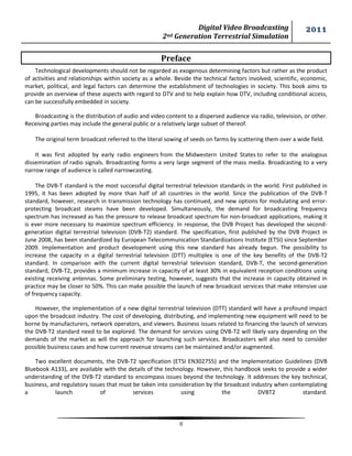 This document discusses the development and implications of the Digital Video Broadcasting - Second Generation Terrestrial (DVB-T2) standard, which offers increased capacity for digital terrestrial television. The authors acknowledge the support and guidance of various individuals during their project, emphasizing the importance of technology and societal factors in broadcasting. The document includes comprehensive technical specifications and considerations for successfully implementing DVB-T2 in the broadcasting industry.