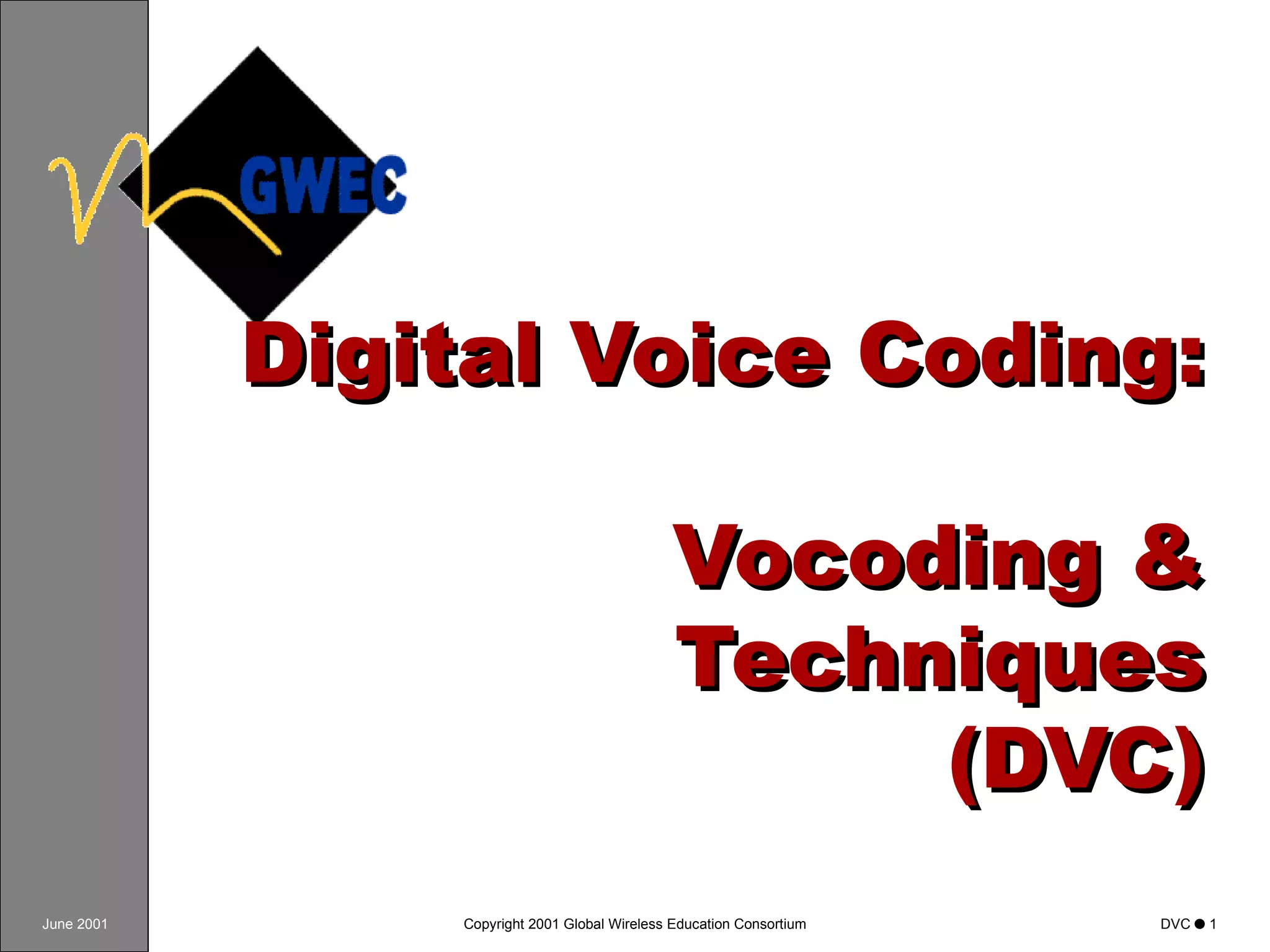 This document provides an overview of digital voice coding techniques used in wireless telecommunications, including pulse code modulation, linear predictive coding, and code excited linear prediction. It describes the objectives of the module as explaining analog to digital conversion, various vocoding methods like CELP, VSELP, and ACELP, and how these techniques allow more efficient use of frequency spectrum. The table of contents lists topics like PCM, linear predictive coders, and the various code excited linear prediction methods that will be covered.