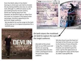 The document discusses design choices for a CD/DVD cover, including emulating the pose of the artist on another album cover to appeal to the target audience, listing songs on the back as is conventional, using bold text for the masthead to catch viewers' eyes, and including a heart on the back cover linking to the artist's songs and music video while giving the cover a gritty, graffiti-like appearance.