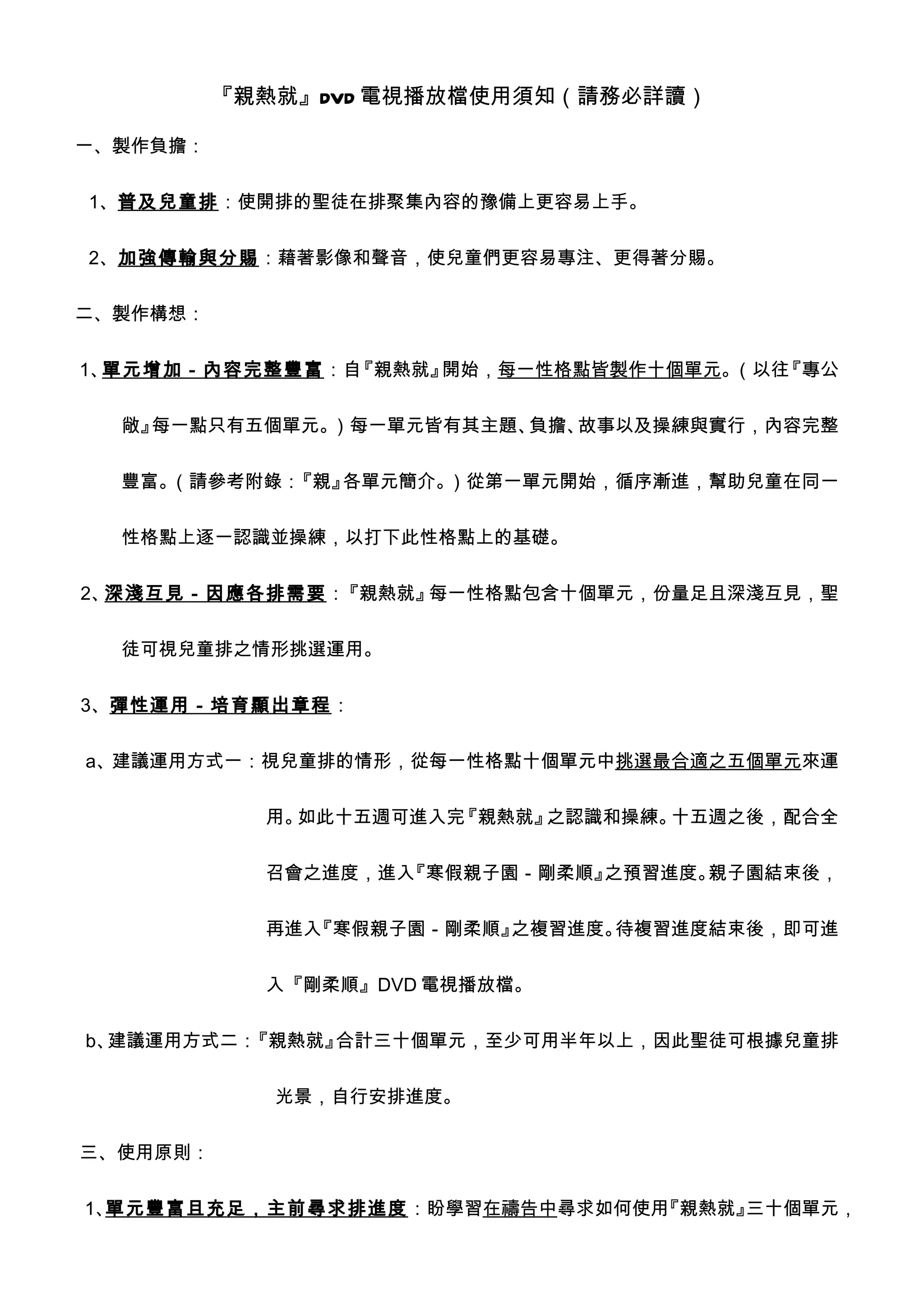 《親熱就》DVD電視播放檔案說明了如何使用這一系列子女教育資源,旨在幫助兒童在性格上得到充分培育。教材分為30個單元,每單元包含主題、故事及操練,並提供靈活運用的建議以符合不同年齡的需求。使用者需在禱告中尋求指導,確保孩子們在靈性上得到應有的成長與支持。