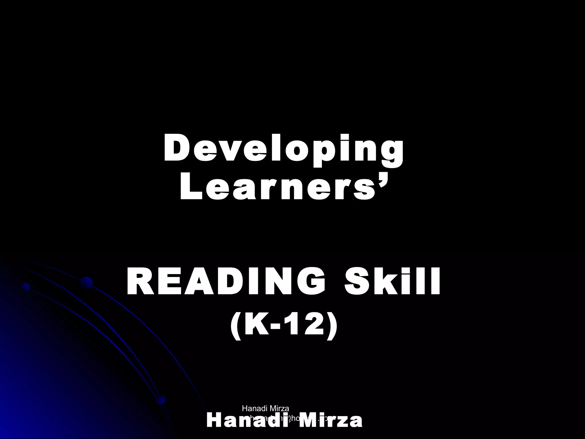 This document provides an overview of strategies for developing reading skills from kindergarten through university levels. It discusses teaching phonemic awareness, phonics, vocabulary, fluency, comprehension, and the reading process. Specific techniques are outlined for each level, including activities for teaching sounds, blending, spelling patterns, meaning of words, and developing reading strategies. The document also addresses common problems readers face and suggests sharing solutions between teachers.