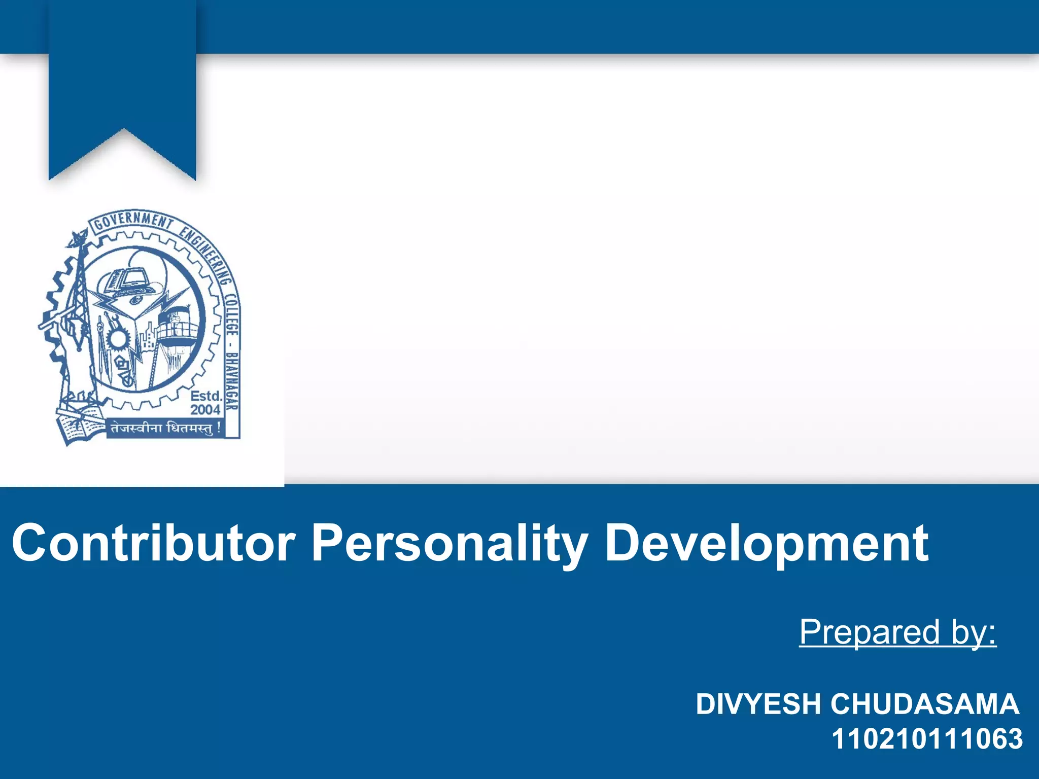 This document discusses contributor personality development. It aims to recognize contributor qualities that make people valuable team members. A contributor personality is defined by performing work well, achieving goals ethically, and showing care for others. Key qualities to look for include honesty, sympathy, trust, calmness, and positive thinking. The document profiles an exemplary contributor, Mr. Samir Vora, a math teacher with 8 years of experience who overcame poverty to achieve his goal of becoming a teacher. He shares the message to students that with confidence, nothing is impossible.