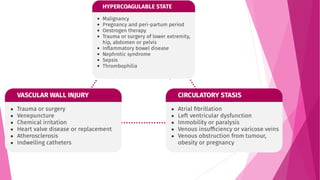 1) Deep vein thrombosis (DVT) can be caused by Virchow's triad of factors that increase the likelihood of blood clots: damage to vessel walls, slowed blood flow, and increased coagulability.
