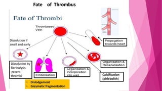 2) DVT presents as either phlebothrombosis, a clot in a healthy vein, or thrombophlebitis, a clot after vein inflammation. Complications include pulmonary embolism and infection.