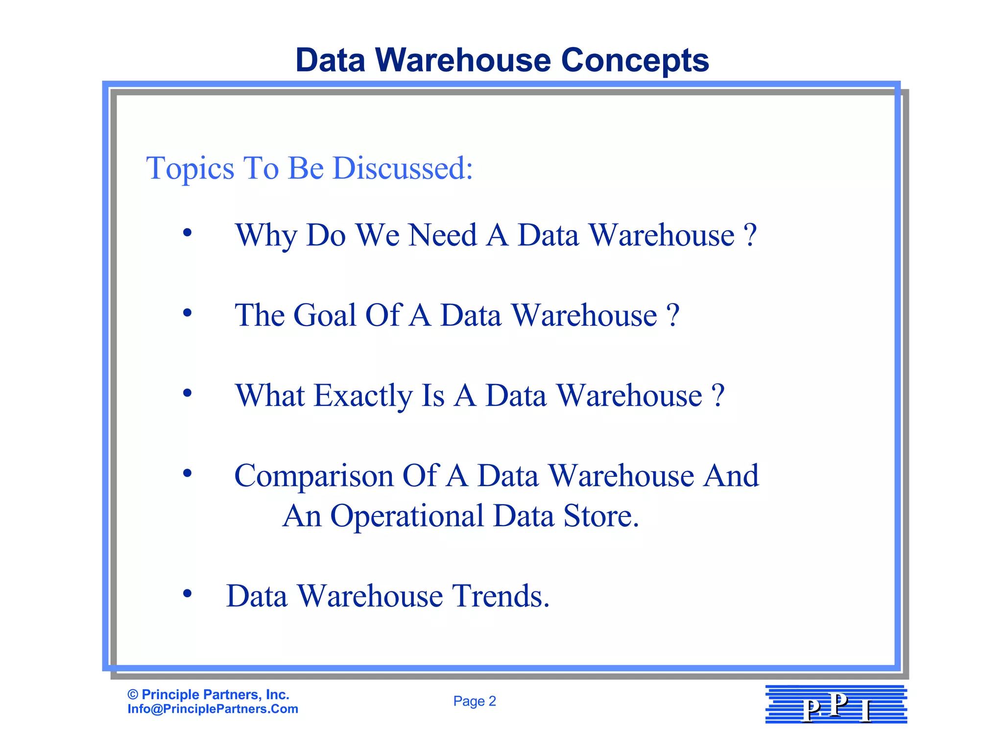A data warehouse is a structured repository of historic data that is subject oriented, integrated, time variant, and non-volatile. It collects and integrates data from multiple legacy systems to provide accessible information to businesses and help manage knowledge so business partners can gain wisdom. A data warehouse loads data from operational data stores and operational systems of record to provide aggregated and multidimensional reports for long term trend analysis and enterprise-wide reporting.