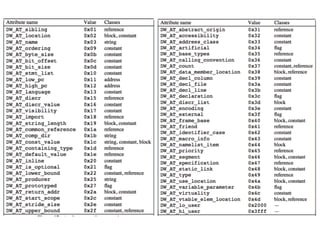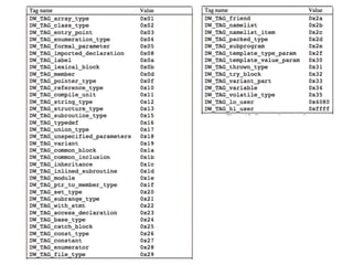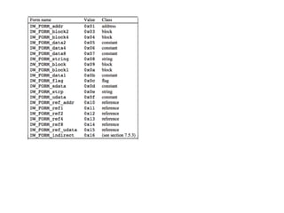 The document describes the DWARF debugging format specification. It includes sections for debug_info, debug_abbrev, debug_line, debug_frame, and debug_aranges. The debug_info section contains compilation unit headers and debugging information entries. The debug_abbrev section contains abbreviation declarations that specify tags and attributes for debugging information entries. The debug_frame section contains Call Frame Information including CIE and FDE entries that describe how registers are saved and restored by procedures.