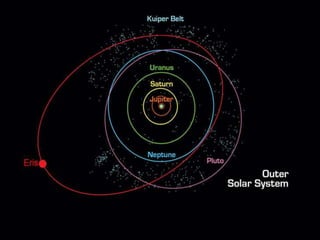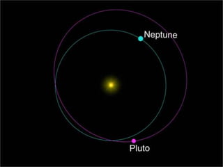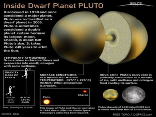 Pluto is classified as a dwarf planet located in the Kuiper Belt beyond Neptune's orbit. It has a diameter less than one-fifth of Earth and a surface composed of ice such as methane and nitrogen. Pluto has 5 known moons - Charon, Nix, Hydra, Kerberos, and Styx. In 2015, the New Horizons probe conducted the first flyby of Pluto and provided more details of its geology, moons, and atmosphere.