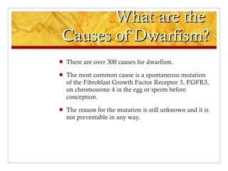There are over 300 causes of dwarfism, with the most common being a spontaneous mutation of the FGFR3 gene. The two main types of skeletal dysplasia that cause dwarfism are short trunk with average limbs, and average trunk with shorter limbs and larger head. People with dwarfism can lead normal, healthy lives through treatments like surgery, nutrition plans, physical therapy and hormone injections depending on the type of dwarfism. The likelihood of having a child with dwarfism depends on factors like the parents' height and whether one or both parents carry a dwarfism gene.