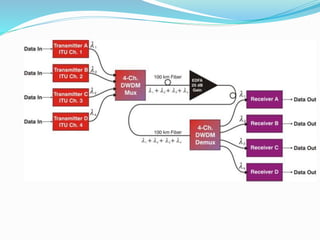 This document discusses dense wavelength division multiplexing (DWDM) technology. It begins with an overview of DWDM, describing how it multiplexes multiple optical carrier signals onto a single optical fiber using different laser light wavelengths. It then provides details on DWDM network architecture, including optical transponders, multiplexers/demultiplexers, optical add-drop multiplexers, optical fiber amplifiers, and the optical supervisory channel. The document also discusses optical frequency bands defined by the ITU and advantages and limitations of DWDM networks.