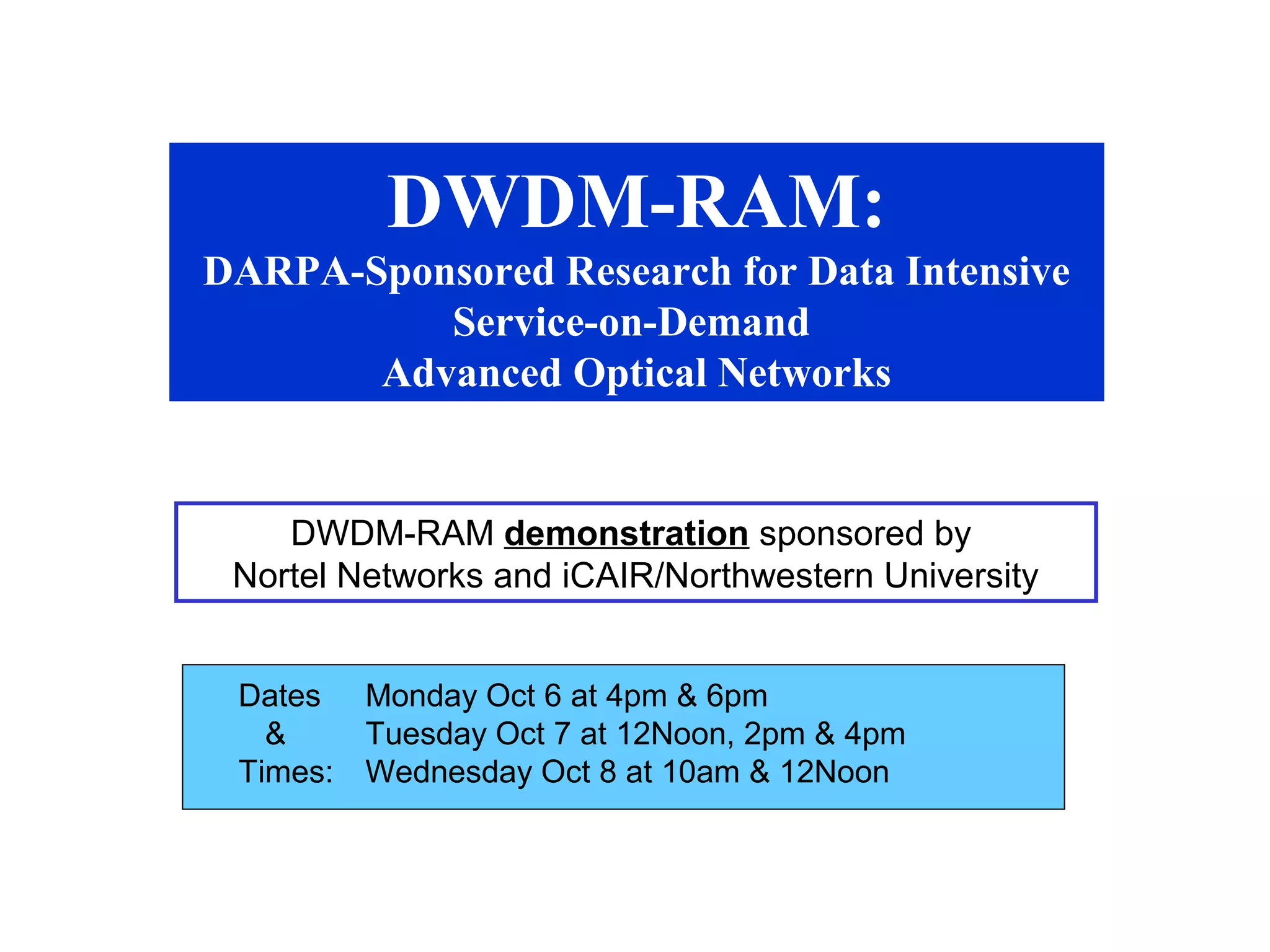 DWDM-RAM is an architecture designed to meet the networking challenges of extremely large scale Grid applications by providing dynamic optical networking capabilities. It includes data management services, intelligent middleware, and dynamic lightpath provisioning services using state-of-the-art photonic technologies. These capabilities are being demonstrated on OMNInet, a wide-area photonic testbed, to enable high-performance data transfers for applications through on-demand lightpaths.