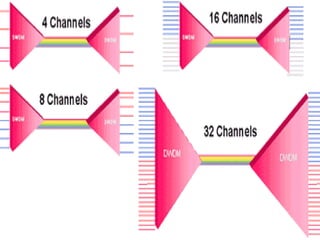 Dense Wavelength Division Multiplexing (DWDM) is a fiber-optic transmission technology that multiplexes multiple wavelength signals onto a single fiber, significantly increasing bandwidth capacity for data transmission. It offers advantages such as flexibility, scalability, and cost savings, while posing challenges in network management and conveying certain signal degradation concerns. The DWDM market is rapidly growing, supporting diverse digital signals and facilitating extensive telecommunication applications.