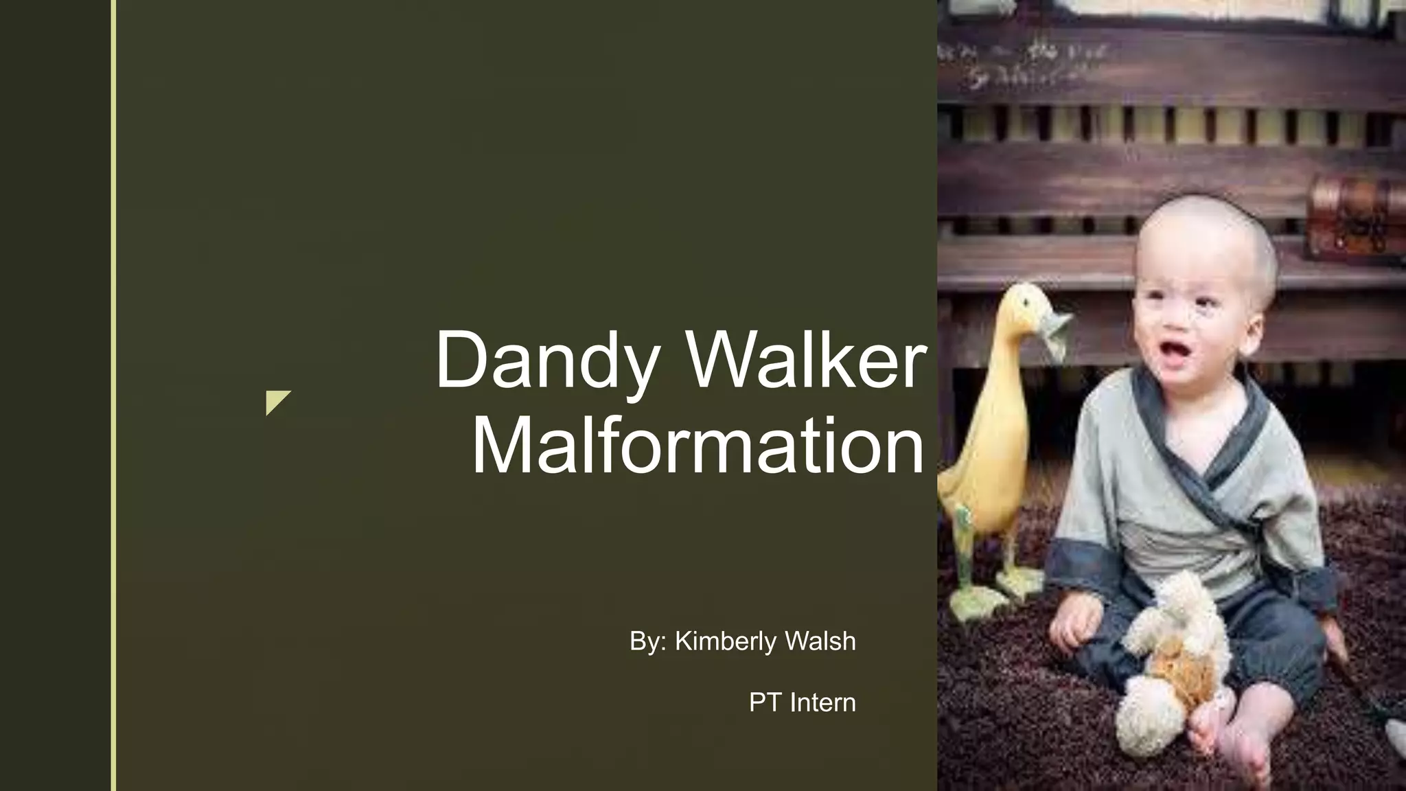 Dandy Walker Malformation is a congenital brain malformation characterized by 3 key features: an enlarged posterior fossa, an abnormal or absent cerebellar vermis, and a cyst in the fourth ventricle. It occurs due to genetic and environmental factors affecting fetal brain development. Patients experience developmental delays, motor problems, seizures, and other issues depending on severity. Diagnosis is via ultrasound, MRI or CT scan. Treatment involves surgery to address hydrocephalus and medications to control seizures. Prognosis depends on defect severity but early treatment can improve outcomes.