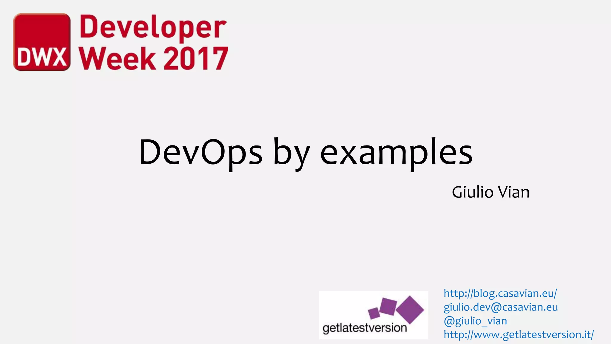 This document provides an overview of DevOps concepts and practices through examples. It discusses DevOps as a culture and movement emphasizing collaboration between development and operations teams. The document demonstrates infrastructure as code, continuous integration and delivery practices like building and packaging applications, as well as deploying applications and managing dynamic configurations. It also discusses monitoring, troubleshooting and creating a feedback loop in production. The document aims to help attendees grasp DevOps essentials and leave with open questions.
