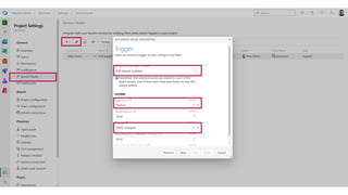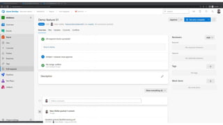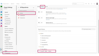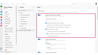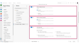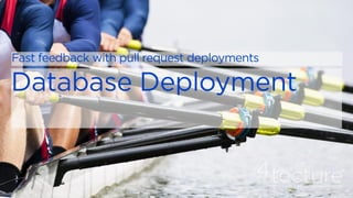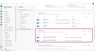 The document outlines a continuous integration and deployment (CI/CD) pipeline process involving multiple stages such as code testing, stabilization, deployment, and verification for applications and databases. It details various tasks, configurations, and tooling, including pull request status updates, environment setups, and deployment verification mechanisms. It also references specific services, infrastructure components, and workflows using Azure DevOps and Docker for managing and deploying applications efficiently.