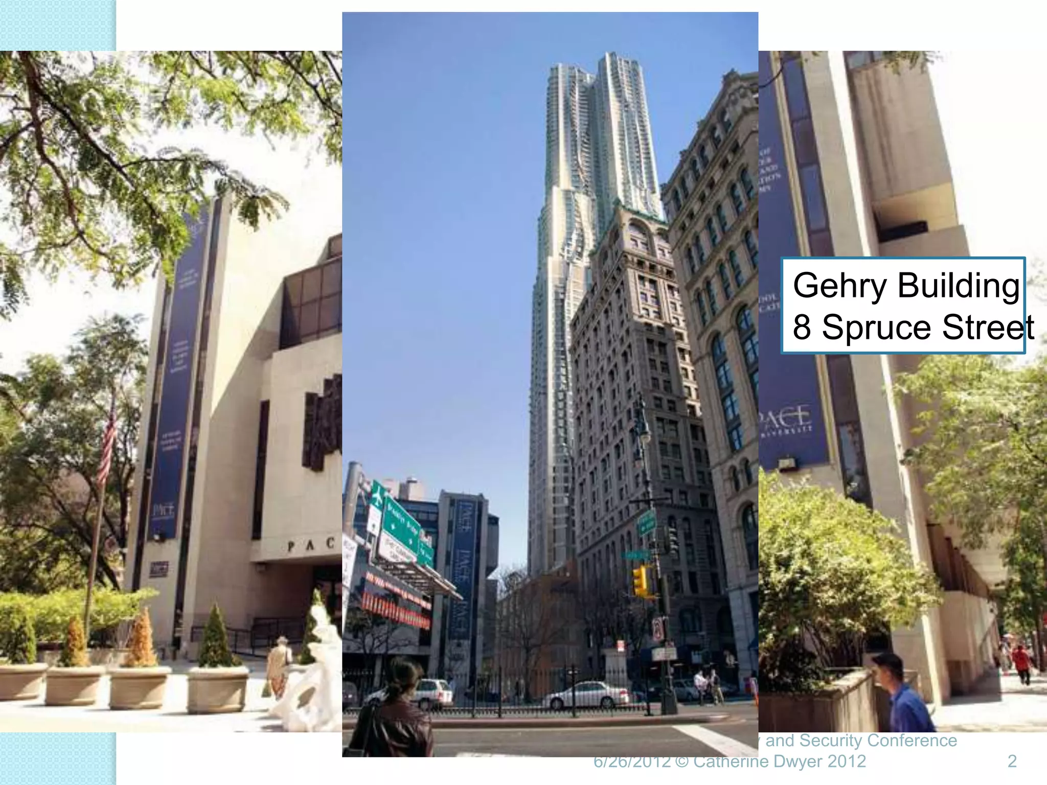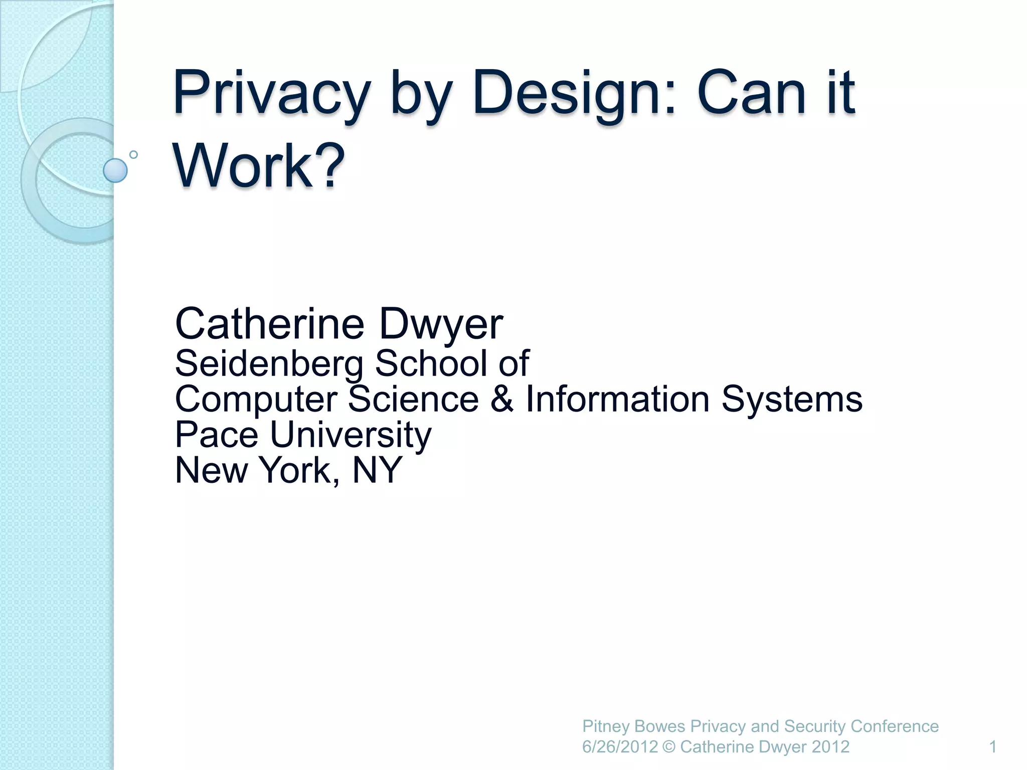 This document summarizes a presentation given by Catherine Dwyer at the Pitney Bowes Privacy and Security Conference on June 26, 2012. The presentation discusses the concept of "Privacy by Design" and argues that it needs to evolve into "Privacy Requirements Engineering" in order to make privacy objectives more tangible and measurable. Specifically, Dwyer recommends emphasizing privacy requirements engineering, developing data visualization tools to model information flows, and determining if privacy requirements are being met within business processes.