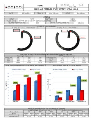 The document is a report on a study comparing flow length and pressure for injection molding using Roctool technology versus conventional technology. It includes: