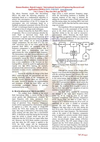 This document describes a novel fast locking digital phase locked loop (DPLL) that uses a flash algorithm approach. The DPLL operates in two stages - a coarse tuning stage using an array of frequency comparators to quickly generate a thermometer code, and a fine tuning stage similar to a conventional DPLL. The coarse tuning stage significantly reduces lock time compared to a conventional DPLL. The document discusses the design and simulation of the flash DPLL components, including novel frequency comparators, multiple charge pumps, and low pass filters to implement the coarse tuning stage. Simulation results demonstrated the flash DPLL achieves significantly faster lock times than a conventional DPLL.