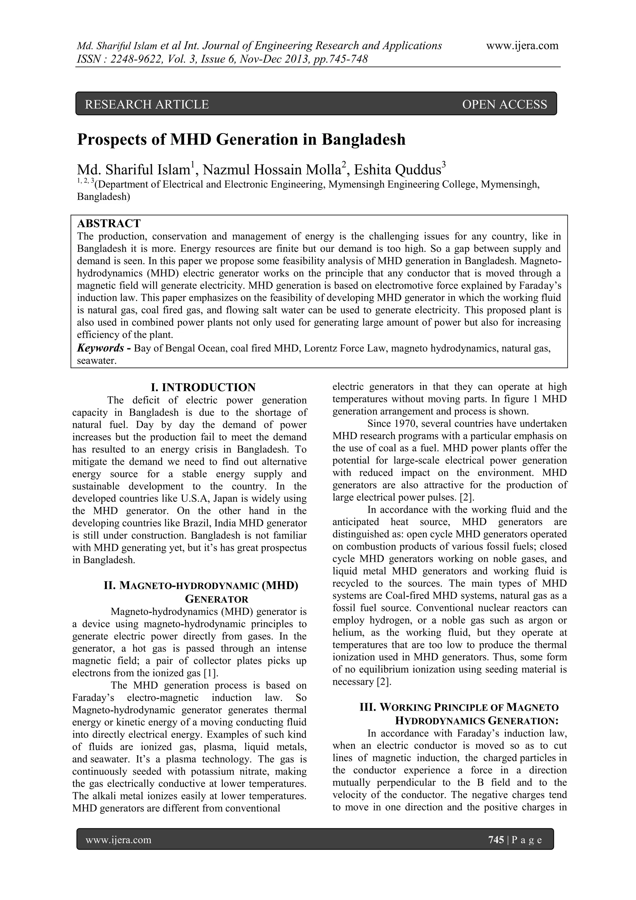 The document discusses the feasibility of implementing magnetohydrodynamic (MHD) generation in Bangladesh as a solution to the country's energy crisis due to high demand and limited natural fuel resources. It explores the potential of using natural gas, seawater, and coal-fired systems for MHD generation, emphasizing the technology's efficiency and environmental benefits. The study concludes that significant investigations are required to assess the chemical composition and practicality of MHD systems in Bangladesh.