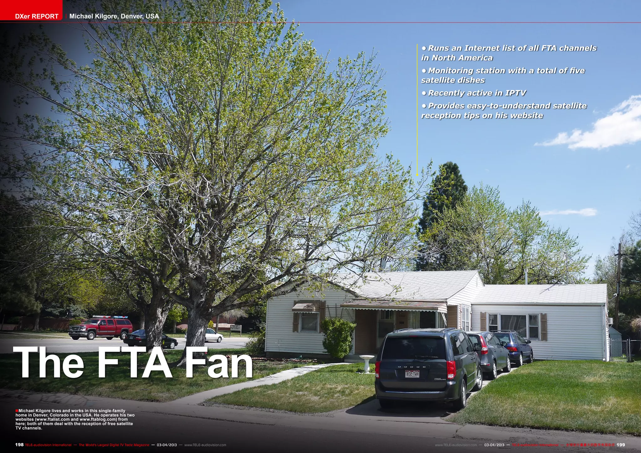 Michael Kilgore operates two websites from his home in Denver, Colorado about free-to-air satellite TV channels. He erected multiple satellite dishes in his backyard to receive these channels, including a 1.2-meter antenna. He started www.ftalist.com in 2004 to provide a consolidated list of all free-to-air channels in North America. The website became a standard source of information on free satellite reception in the US. Kilgore is also interested in emerging technologies like IPTV and recently started his own test TV channel using this method.