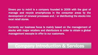 Dinero por tu móvil is a company that manages and recycles used smartphones. It purchases obsolete mobile phone stock from distributors, retailers, and manufacturers. With over 10 years of experience managing stocks and an expertise in logistics costs, DXM redirects stagnant stock to optimized distribution channels globally. DXM's annual turnover exceeds 9 million euros from distributing over 15,000 devices monthly.