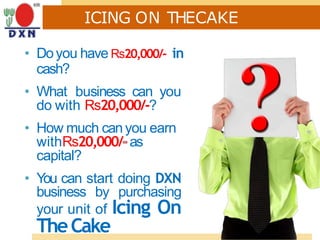 This document describes an "Icing on the Cake" business package offered by DXN for Rs. 20,000. It allows members to purchase DXN products at distributor prices, provides basic training, and entitles them to lifetime income from a 2-2 structure with bonuses from 12 generations. Purchasing the package helps increase recruitment, promotions, and exponential income potential from one level. Profits are shared according to a formula based on a member's percentage of the profit sharing fund accumulated over 6 months.