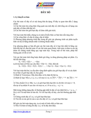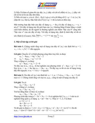 Tài liệu thảo luận về lý thuyết và các phương pháp giải quyết bài toán liên quan đến dãy số, chia thành hai loại chính: tìm công thức tổng quát và giới hạn của dãy số. Các khái niệm như cấp số cộng, phương trình sai phân, và giới hạn của dãy số được trình bày chi tiết cùng với nhiều bài tập minh họa. Tài liệu cũng cung cấp giải pháp cho một số bài toán cụ thể, giúp người đọc nắm vững các phương pháp và định lý trọng tâm trong phân tích dãy số.