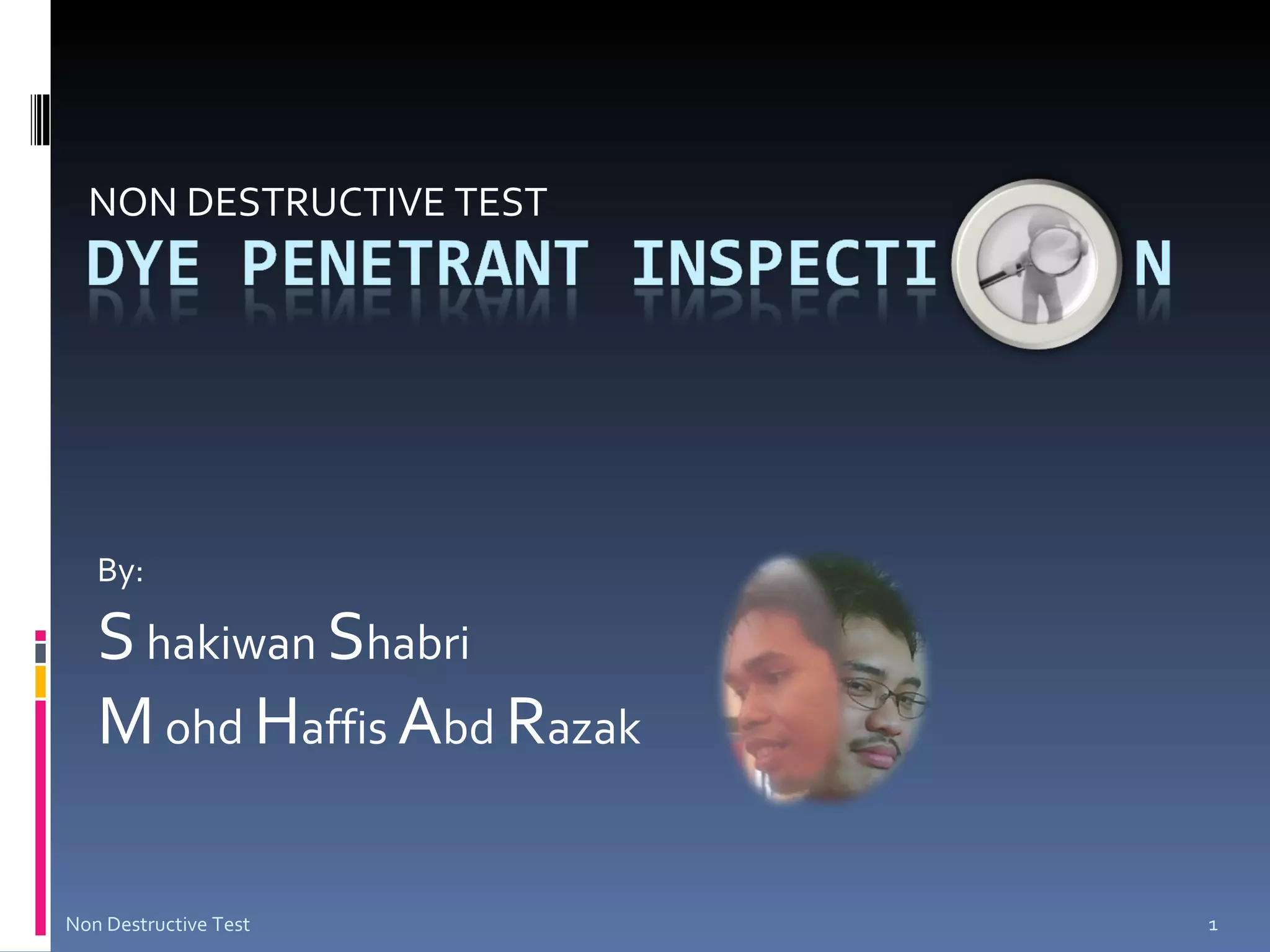 Dye penetrant testing is a non-destructive testing method that uses dye penetrant and developer to locate surface-breaking defects in non-porous materials like metals and plastics. The process involves applying penetrant, removing excess penetrant, and applying developer to make any defects visible. Ultrasonic thickness inspection and radiographic testing are also common non-destructive testing methods. Non-destructive testing allows inspection without damaging the test object.